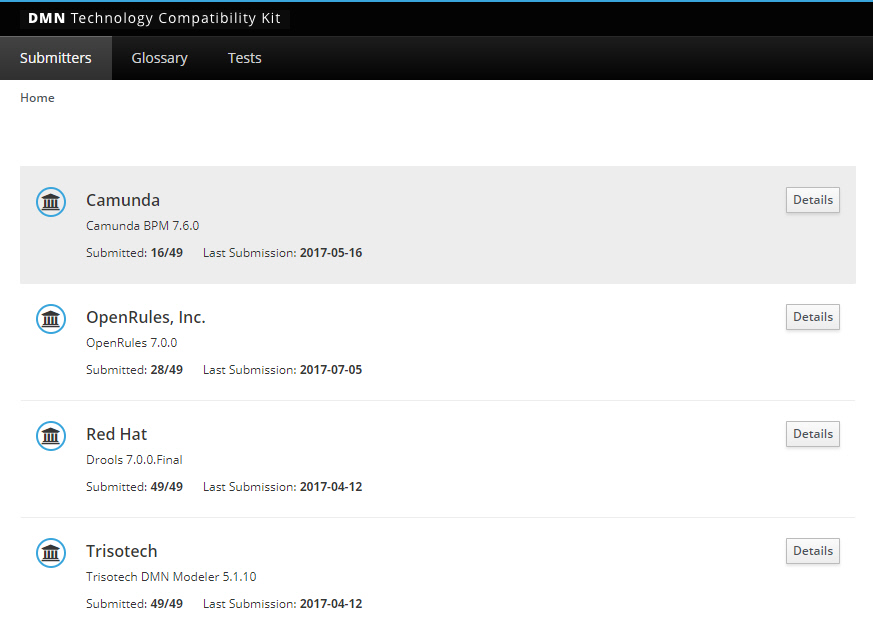 The TCK website is https://dmn-tck.github.io/tck/index.html. At the top you see a summary of the submitters to date: