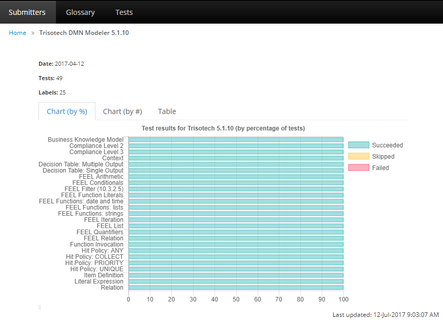 The TCK has already been extremely valuable to participants in clarifying ambiguous requirements of the spec and filtering out test cases that do not fully comply. Tools must be able to import the DMN XML file, but there is no constraint on their internal operation. While we only have 49 tests so far, we expect the number of tests to grow to the hundreds.