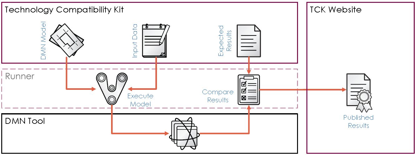 The TCK includes a set of DMN models submitted by members. Each model is provided in the standard XML format along with an associated XML test file that provides values for the input data and expected values for all decision nodes. DMN tools execute the test models with the test input data provided and compare with the expected results. The tool vendor then creates a CSV file listing the tests passed, failed, or skipped, and those results are published on the TCK website. The vendor’s DMN tool is tested as a black box; the TCK imposes no requirements or limitations on its design or runtime environment. Tool vendors are responsible for executing their own tests and reporting the results.