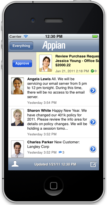 Appian today launched Tempo, a new social/mobile capability of their BPM Suite. Sandy Kemsley has the full details here, which means I don't need to repeat them. I just have a couple comments about it. First, it's really well executed. Clean and smoothly integrated into the BPM environment. Second, it seems a more reasonable implementation of the social/mobile idea than is typically offered by BPM vendors. I have never really bought into the idea of "social BPM" as something distinct from regular BPM, and Appian has shown that you don't need to reinvent BPM to add social/mobile capabilities. Tempo is not a separate product; it's an optional user interface to regular BPM, based on a Facebook-style event stream and subscription model familiar and attractive to many users from a non-business context. Tempo lets you create and track ad-hoc tasks, sure, but that (in my view) is not really BPM. What's important is it lets you also do real BPM, i.e. structured processes, within the same environment. From your smartphone or iPad, you can perform tasks of either type, often just by "swiping" the entry, quick and easy. BPM vendors that insist on a separate "place" for users to do ad-hoc BPM are missing the boat. Who wants that?