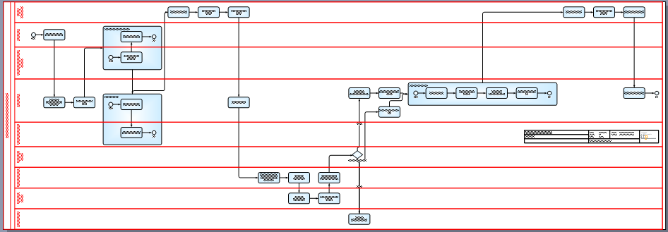 The lanes are back! Actually, I had to do two things first in Visio. Send the expanded subprocess shapes to the back layer in order to see the connectors, and change the page size (fixed at A4 in the XSLT) to fit the drawing. Note the connectors do not touch the activities in exactly the same place as in the Blueprint original, but the general layout is preserved.
