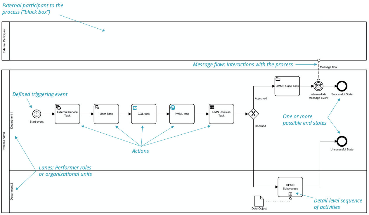 The ability to understand the process behavior in detail simply by inspecting the diagram, unfortunately, was not top of mind in the BPMN 2.0 task force in 2010. They were solely focused on making the diagrams executable on an automation engine. But to most BPMN users today, precise description based on the diagram alone is much more important. That requires additional conventions on top of the concepts and rules of the spec. The ones I use are called Method and Style. Much of the need for BPMN Method and Style arises from the fact that the process behavior - which path out of a gateway is taken, for example - depends on the values of data objects. But BPMN 2.0 removed data objects from the modeler domain and moved them to the Java programmer domain, so they are not used in non-executable models. To compensate for this, Method and Style's conventions assign meaning to things that are actually used in non-executable diagrams, such as the labels on end events and gateways or the icon of a start event.