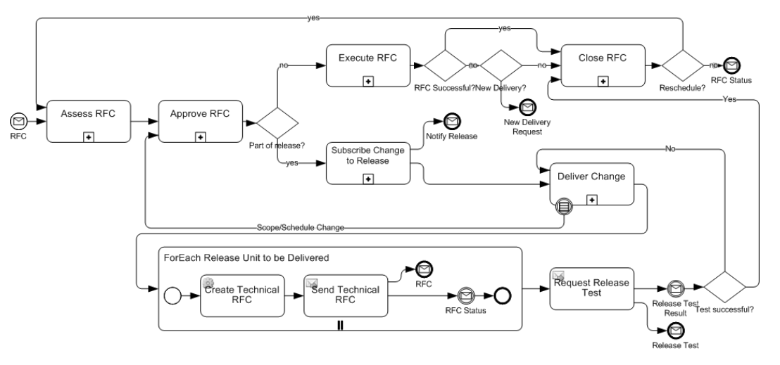 The second interesting thing (to me) is the use of the multi-instance subprocess to solve the 1:N problem. In BPMN, an activity (task or subprocess) can optionally be defined as a simple (While) loop, a multi-instance (ForEach) sequential loop, or a multi-instance (ForEach) parallel loop. The last of these is what is indicated here by the parallel bars (VCR "pause" symbol) at the bottom of the activity. It means generate N instances of this subprocess, and the activity is not complete until all N instances complete. In this case each instance represents a Technical RFC generated from a Business RFC, and the subprocess spawns a new instance of Change Management for the Technical RFC and waits for RFC Status.