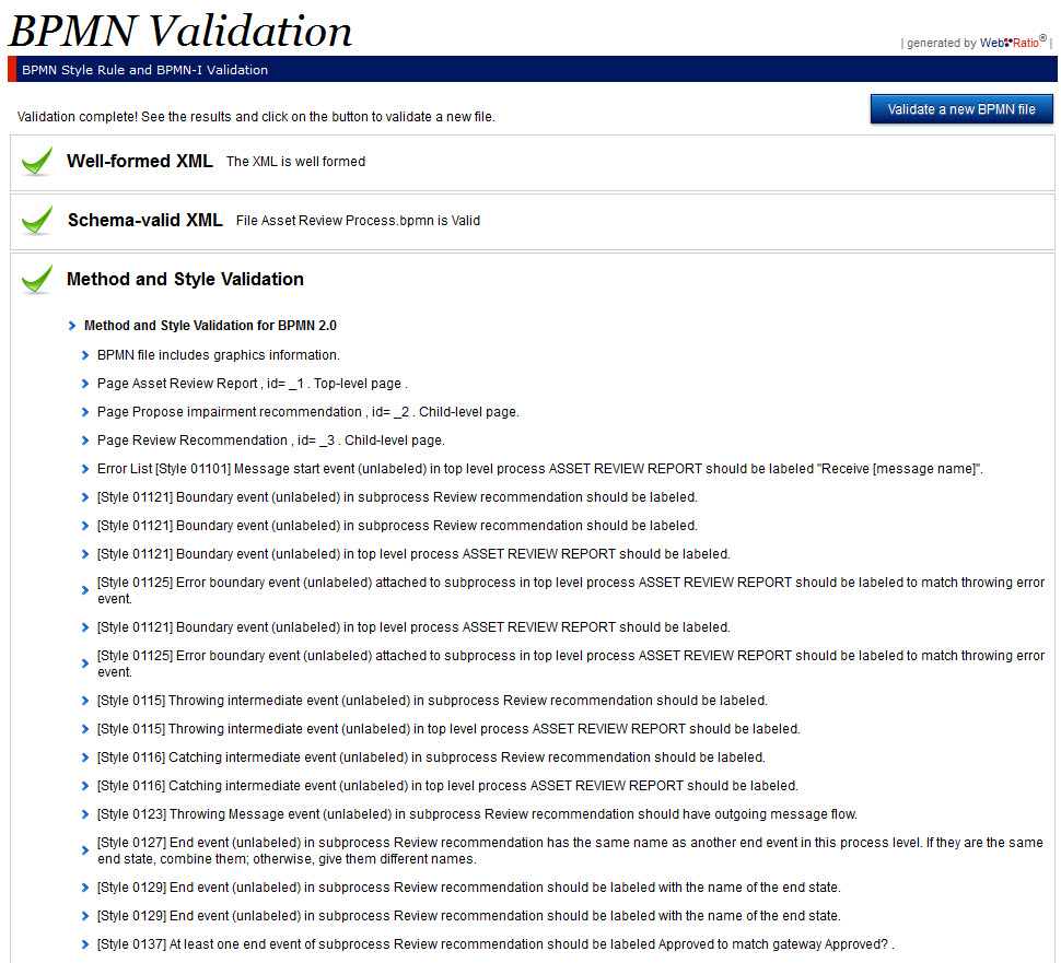 The link is www.webratio.com/bpmnValidation. I invite you to try it out. You need to upload a file in the BPMN 2.0 XML format. The tool performs four checks: 1)well-formed XML; 2)valid per BPMN 2.0 XSD; 3)BPMN 2.0 and style rule validation; 4)BPMN-I Profile validation. Thank you, Sebastian and Aldo of WebRatio! And you as well, Marco. WebRatio... I'm a believer!