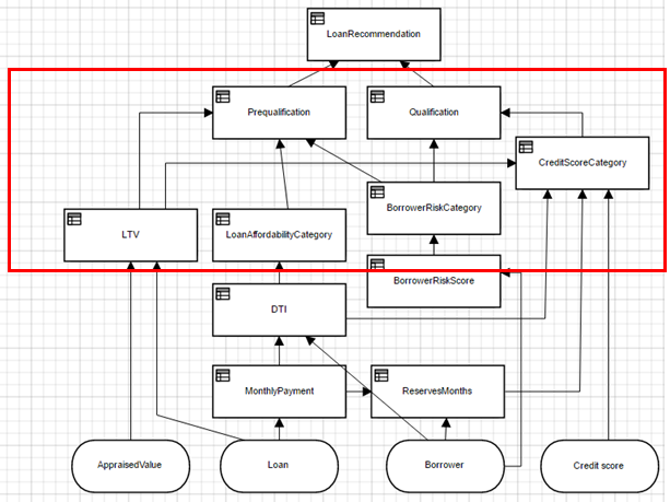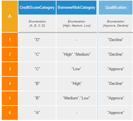Instead of trying to figure out all combinations of these factors that recommend Approve or Decline, instead we combine subsets of them to define several risk categories: the borrower’s credit risk, loan affordability risk, collateral risk, etc. For each of these, the outcome is an enumerated list, such as High, Medium, or Low. Each risk category value is determined by just a subset of the factors in the overall lending decision. In DMN, the risk category is modeled as a decision table with enumerated output values High, Medium, and Low. This is a classification decision.