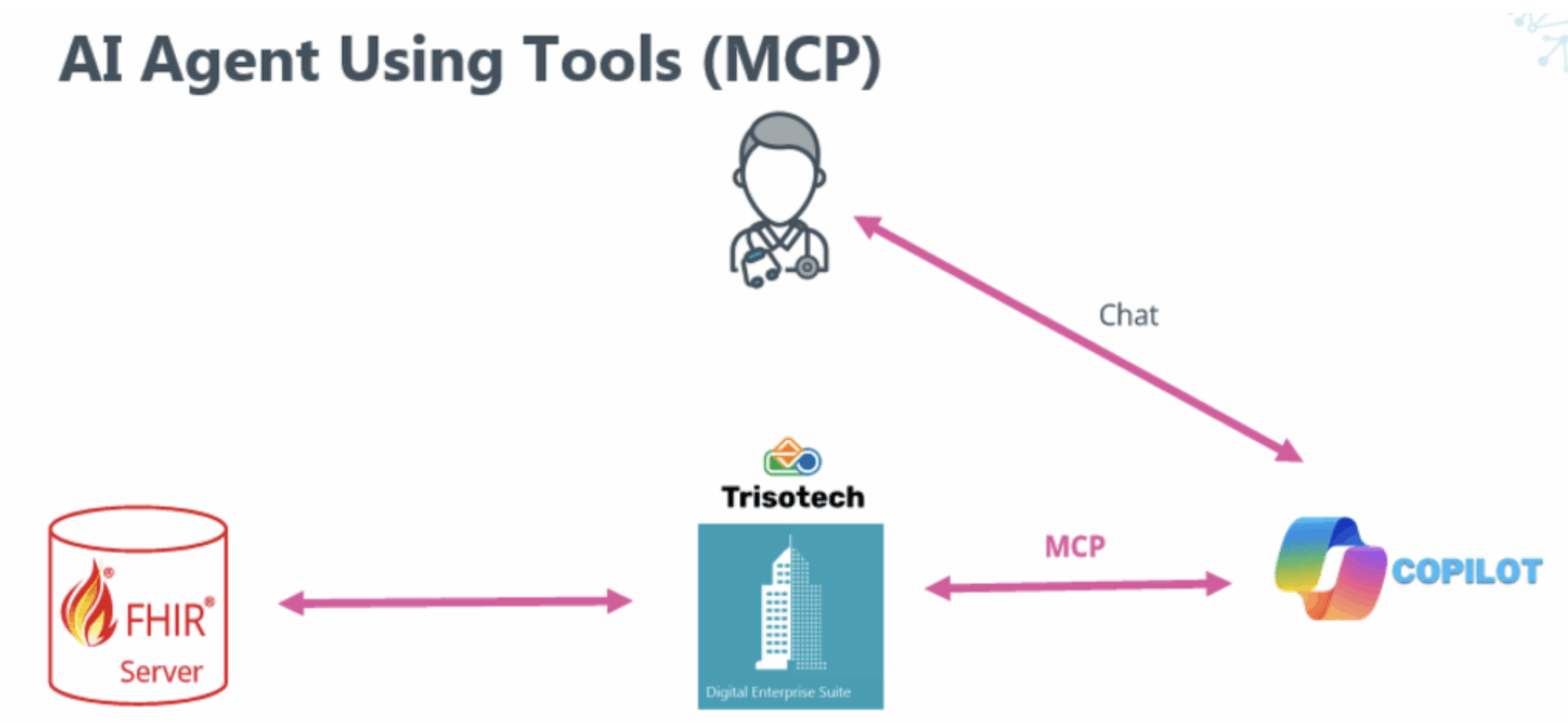 Let’s look at a Healthcare example where the user interacts with the Agent Host Copilot via Chat, which connects to Trisotech via MCP. Details of the user’s health records (FHIR Server) are invisible to the agent; only information returned by the Trisotech service is exposed.
