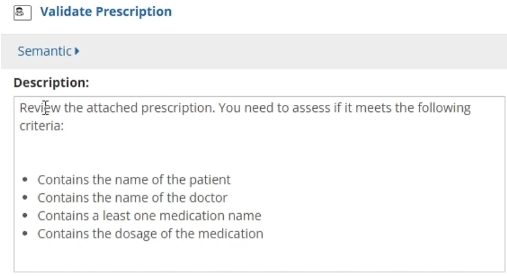 The agent must be created using the Azure OpenAI tools with the goal of validating that the data inputPrescriptioncontains the elements listed in the task Details, true or false. When you test this in the Decision Modeler with complete information, the agent returns true. Omit some, such as the prescribing doctor, and the agent returns false.