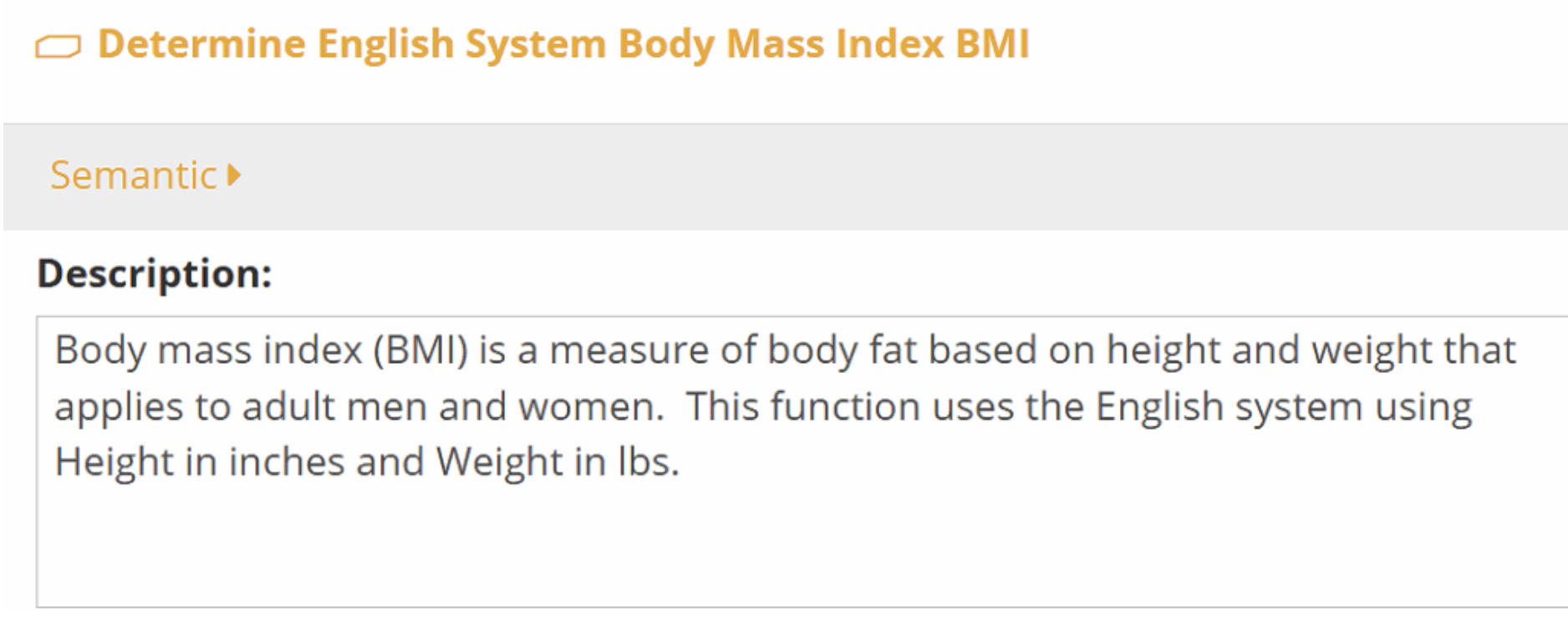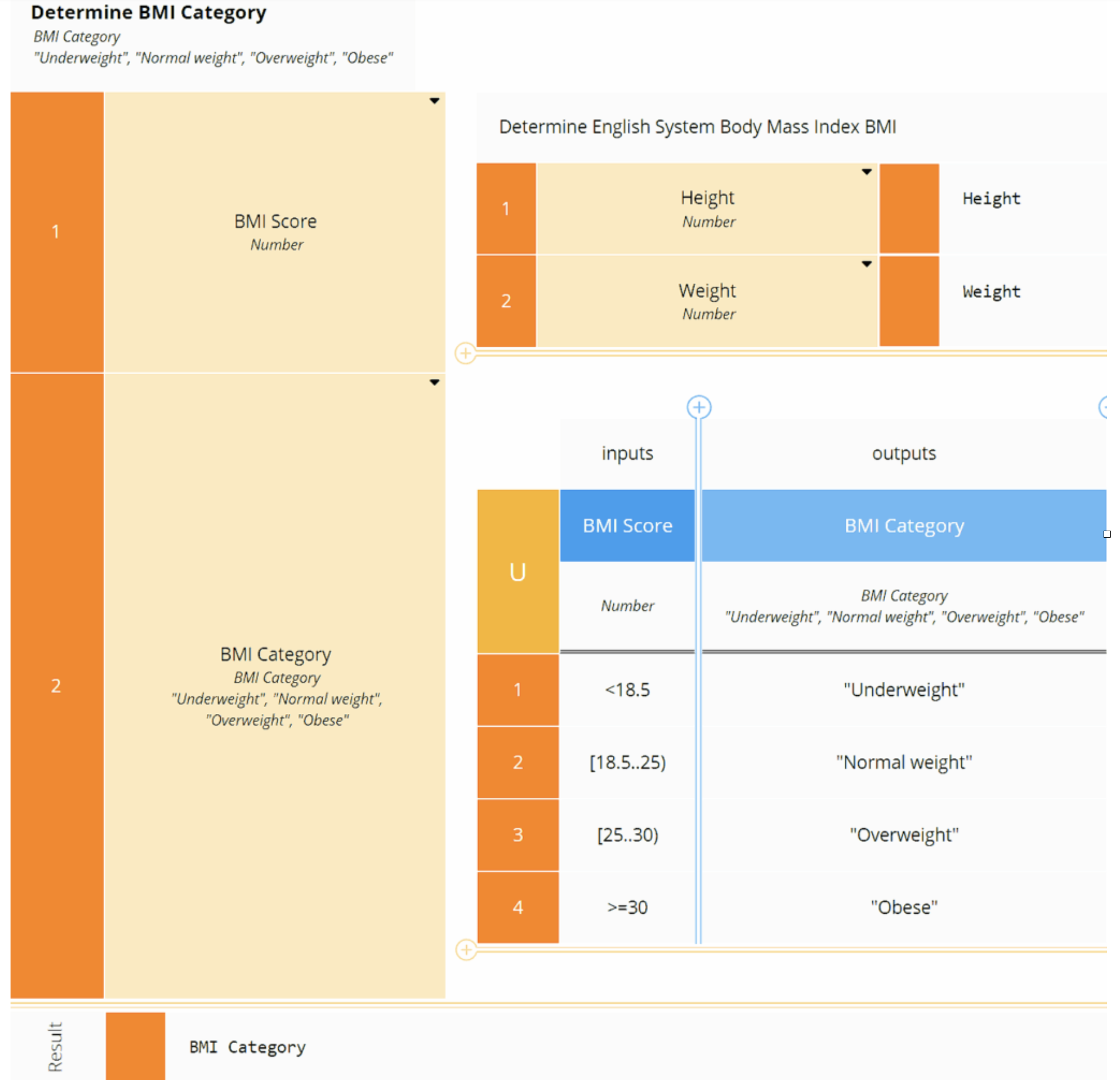 In the Trisotech Examples folder is a simple decision service, Calculate BMI Category. A BKM computes the Body Mass Index from Height and Weight, and then a decision table matches that to a category.