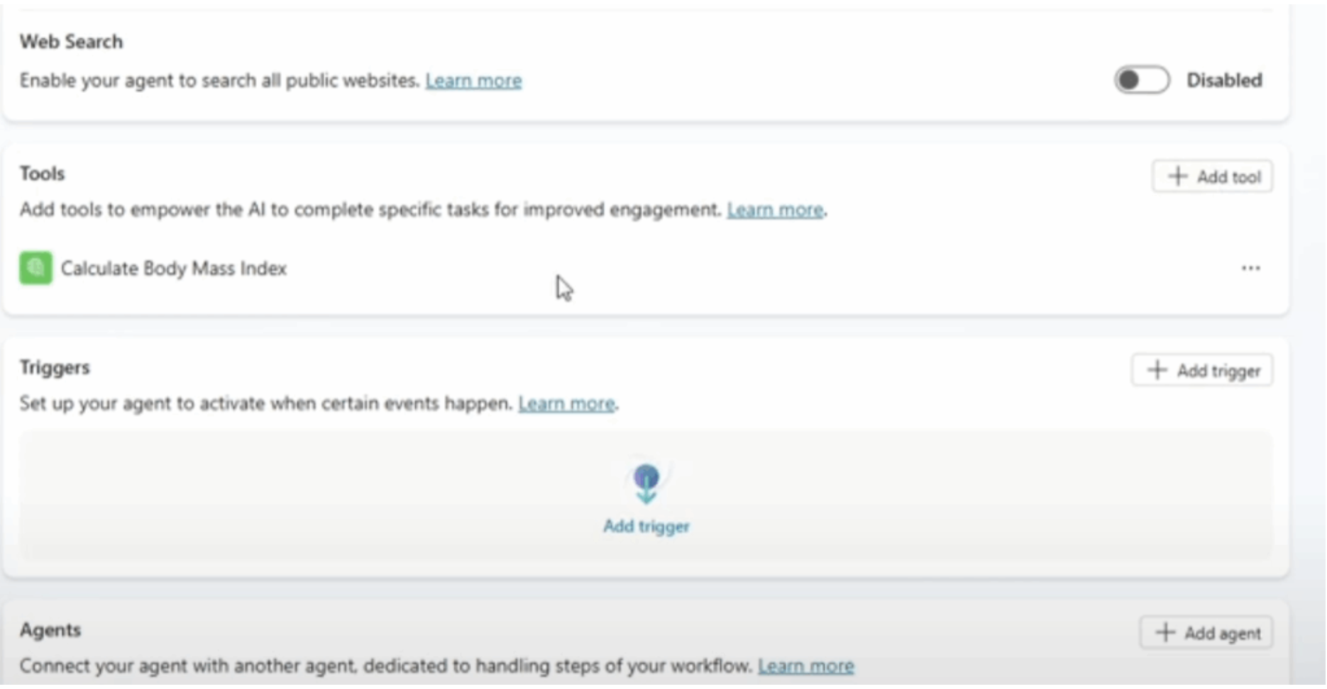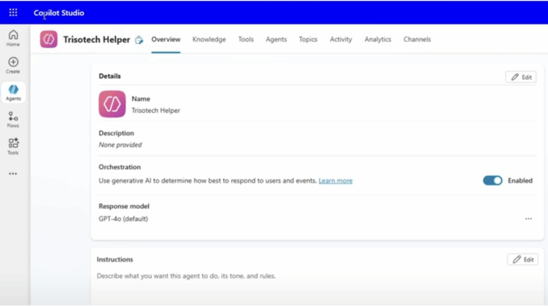 We can use MCP to provide a simple conversational interface to this service. Of course, Agentic AI can do more powerful things, but this illustrates the integration. To create the agent calledTrisotech Helperin Azure Copilot we use Microsoft Copilot Studio.
