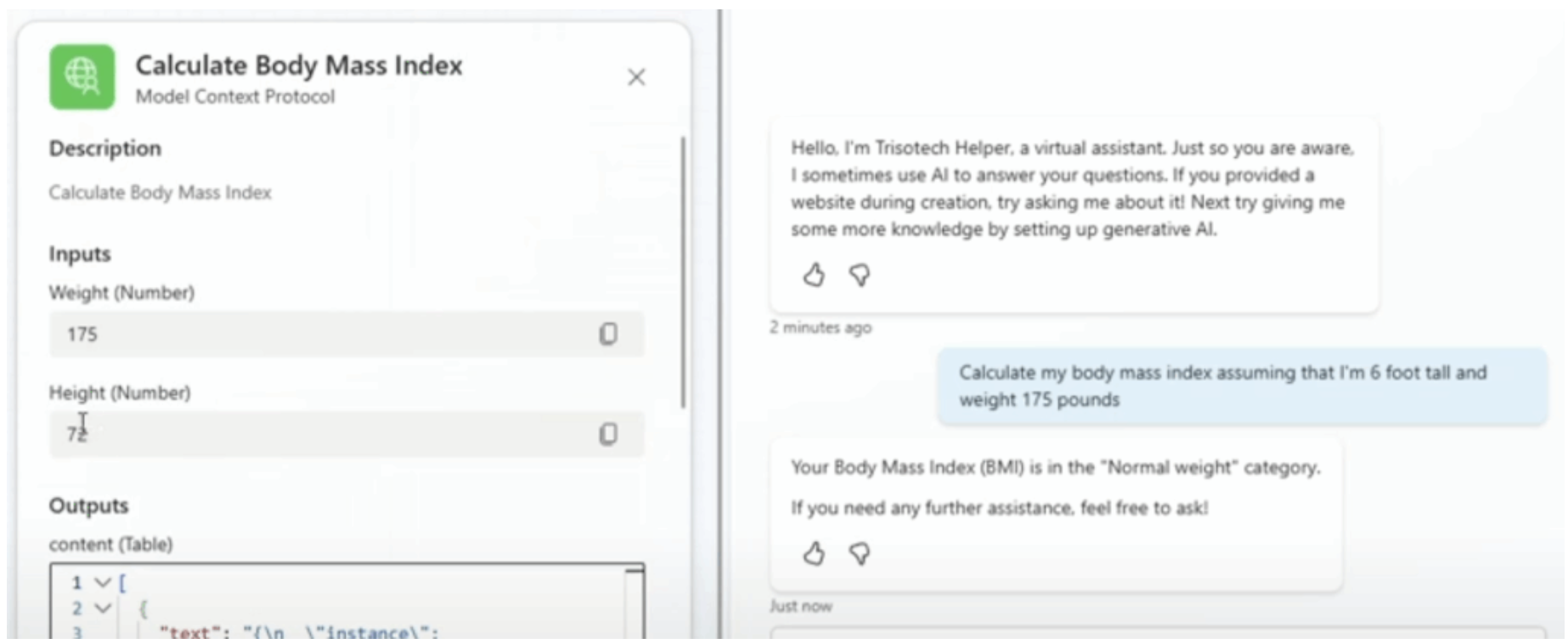 The agent knows this means use Height = 72 (inches) and Weight = 175. That’s pretty amazing. It then executes the service, returning “Normal”. The response generated using ChatGPT is “Your Body Mass Index (BMI) is in the ‘Normal weight’ category”.