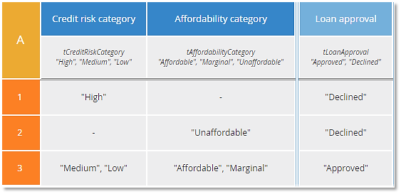 Now rule 2 is simpler because the column 1 condition is hyphen. But notice that if Credit risk category is "High" and Affordability category is "Unaffordable", both rules 1 and 2 match. Those rules overlap. Here the hit policy A (for Any) warns us that rules may overlap, but with A tables overlapping rules must have the same output value. And here they do: "Declined". To me, this table expresses the logic more plainly than the U table: If either Credit risk category is "High" or Affordability category is "Unaffordable", Loan approval is "Declined", otherwise "Approved".
