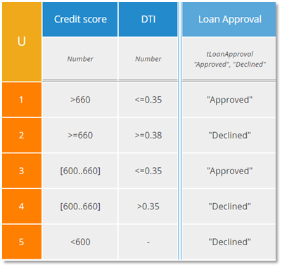 Consider this decision table that determines whether Loan approval is "Approved" or "Declined" based on inputs Credit risk category and Affordability category. Without any prior DMN knowledge, most users intuitively understand that the columns to the left of the double line are the inputs, the column to the right of the double line is the output, and the numbered rows are the rules. Note here we also see the datatypes of the inputs and output, in this case enumerated allowed values.