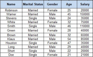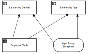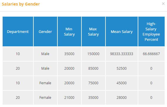 This is not really a business decision but calculations on tabular data that could be embedded in some larger decision logic. The table provided omits a column for Department Number, so I added that, assigning the first 6 to Department 10 and the second 6 to Department 20. The tool is Trisotech DMN Modeler with embedded RedHat Drools 7 for execution.This is really about presentation of the results. I chose a tabular breakdown of salary metrics by department and gender, and another by department and age category. The DRD is shown above. The input is specified as a zero-input decision, Employee Table. Trisotech allows import of the table from Excel. There is one adjustable parameter, High Salary Threshold. I ran it with the suggested value $85,000.