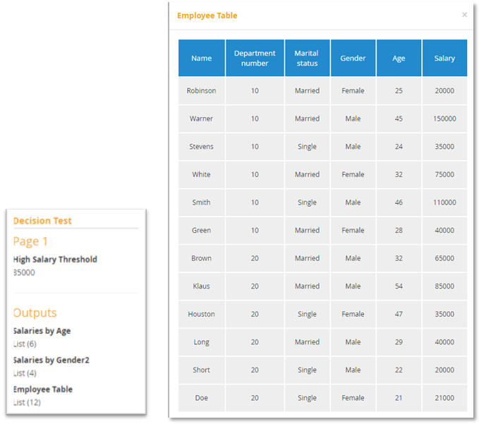 A human resource office has information about all employees in every department including: salary, marital status, age, etc. Help the office to create a decision model that for each department calculates minimal, maximal, and average salaries along with a number of high-paid employees using rules like “Salary > 85000”.