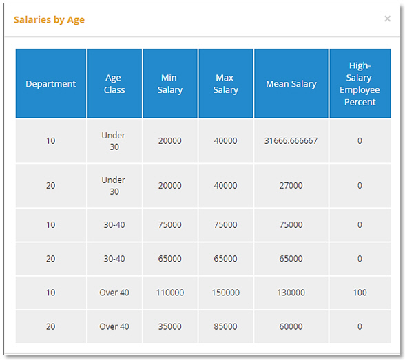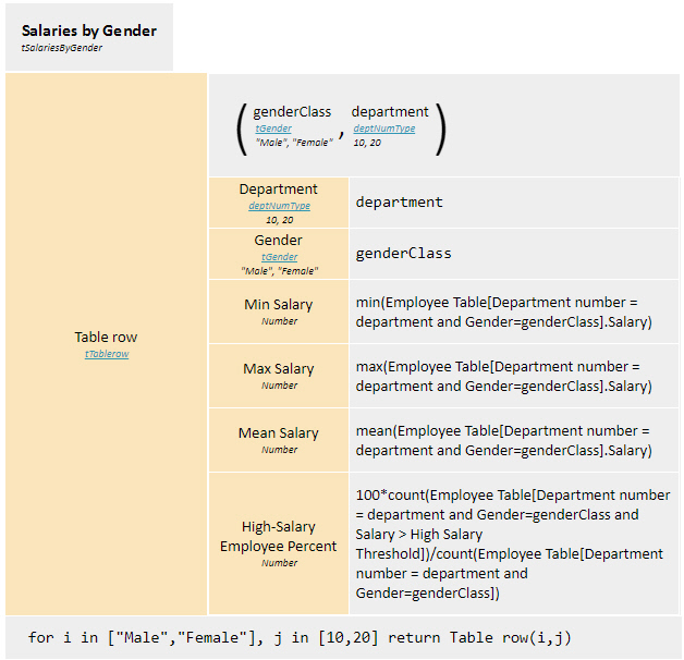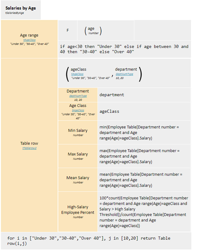 Salaries by Age is similar, except that here we need an additional function Age range to classify the employee age into one of 3 categories. This is the first context entry. Table row is similar to the one in Salaries by Gender, except that the logic now references the Age range function. Again, the final result box performs double iteration to create the table.
