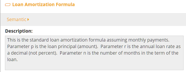 Here I have that BKM previously saved in my model repository under the name Loan Amortization Formula. On the Trisotech platform, I can simply drag it out onto the DRD and replace the BKM Payment Calculation with it. The BKM definition is shown below, along with an explanation of its use from the BKM Description panel. It has three parameters - p, r, and n, representing the loan amount, rate, and number of payments over the term - shown in parentheses above the value expression. The value expression is again a FEEL literal expression. It can only reference the parameters. The formula is just arithmetic - the ** symbol is FEEL's exponentiation operator - but as you see, it's complicated.
