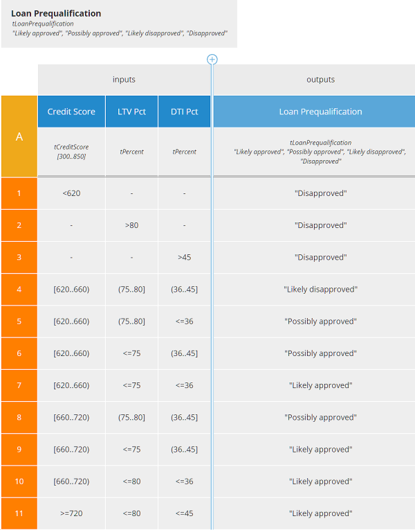 Qualifying for a home mortgage depends primarily on three factors: the borrower's Credit Score, a measure of creditworthiness; the Loan-to-Value ratio, dividing the loan amount by the property appraised value, expressed as a percent; and the borrower's Debt-to-Income ratio, dividing monthly housing costs plus other loan payments by monthly income, expressed as a percent. Those three decision table inputs are represented by the columns to the left of the double line. The decision table output, here named Loan Prequalification, with possible values "Likely approved", "Possibly approved", "Likely disapproved", or "Disapproved", is the column to the right of the double line. Below the column name is its datatype, including allowed values. Each numbered row of the table is a decision rule. Cells in the input columns are conditions on the input, and if all input conditions for a rule evaluate to true, the rule is said to match and the value in the output column is selected as the decision table output value.