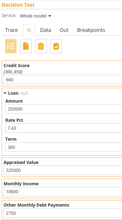 At this point, our decision model is complete. But we need to test it! I can't emphasize enough how important it is to ensure that your decision logic runs without error and returns the expected result. So let's do that now, using the input data values below: