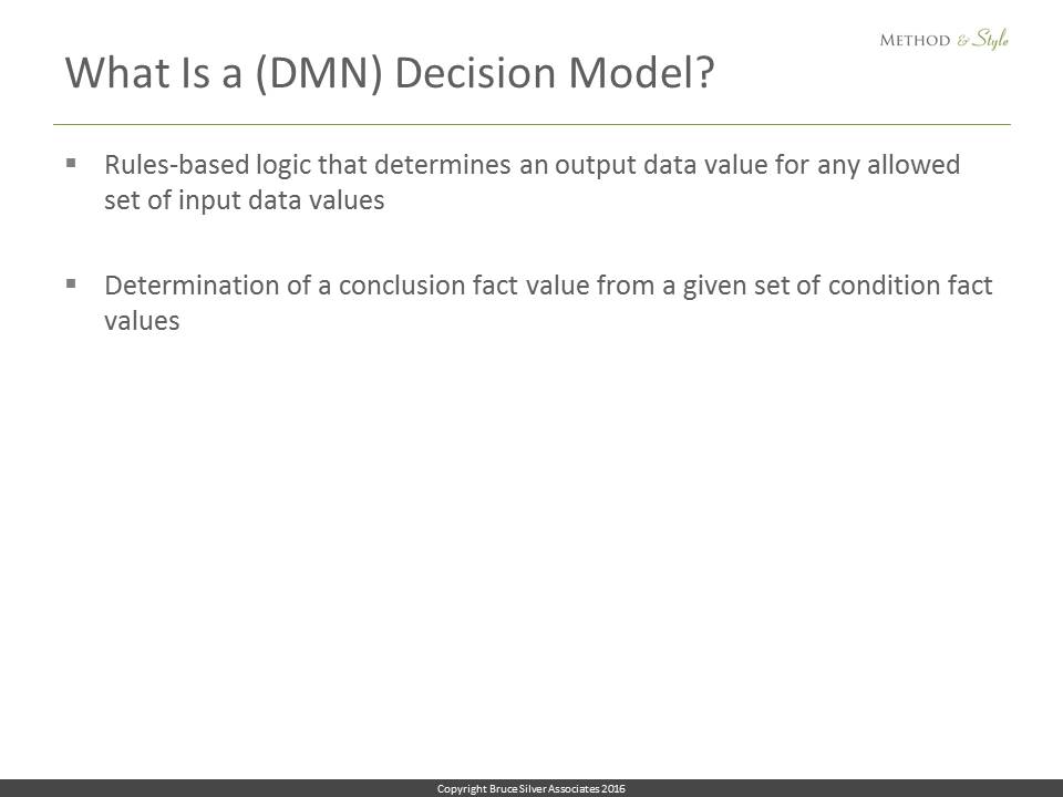 First, what is a decision? As we said, it’s determination of an output fact value from a given set of input fact values, where a fact, in DMN terminology, is a variable with a specified domain of allowed values. In DMN, each decision is comprised of a variable that holds its output value, and a value-expression that contains the logic that determines that value. DMN’s value expressions are based on decision rules: if condition1 is true and condition2 is true, then the output value is X. Decision rules are a class of business rules, but not all business rules are decision rules. For example, constraint rules are not decision rules.