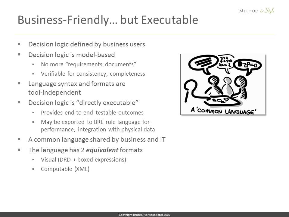And Level 1 says, actually business users don’t want to even think about decision tables and other kinds of decision logic at all. They just need a better way, a model-driven way, to define business requirements for the programmers. Level 1 is business-friendly and tool-independent, but the logic is not precisely defined, so it cannot be tested. So this is like a 2-legged stool. Long-term, we know how that goes.