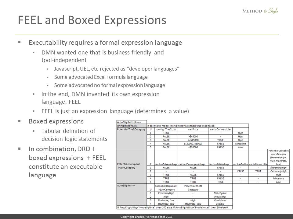 Now we’re getting to the heart of the matter. Because that expression language needs to be both business-friendly and at the same time rich enough to handle real-world decision logic. The original DMN task force struggled with this. Some were against any formal expression language. Some wanted their own rule language. In the end, Gary Hallmark of Oracle won the day with his contribution, a brand new expression language called FEEL, and a tabular format for assembling those expressions into something like program statements, called boxed expressions.