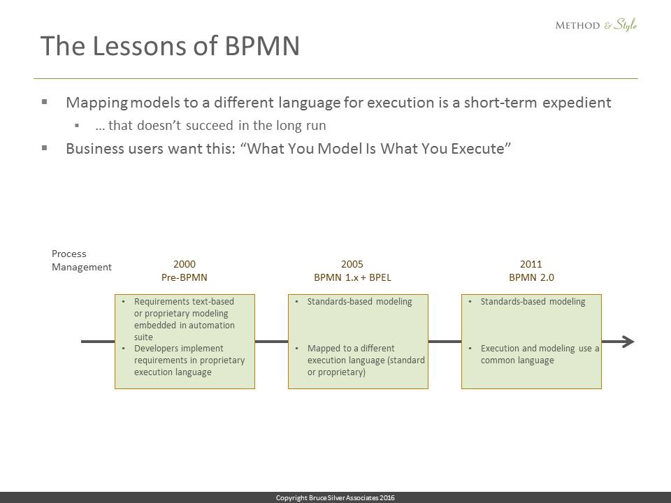 I mentioned at the beginning that I’ve seen that movie before, with BPMN. BPMN was originally just a diagramming notation, not executable. Around 2005, BPM vendors like IBM, Oracle, and SAP thought that was OK because BPMN models could be translated into a similar process execution language called BPEL. By 2008 it was clear that customers did not agree. Even though BPMN and BPEL were similar, the languages were not the same. Certain things you could draw in BPMN you couldn’t execute in BPEL, and vice versa. The whole magic of BPMN’s promise to the business – that what you model is what you execute – proved false, and it was the beginning of the end for BPEL in BPM. So IBM, Oracle, and SAP rushed to develop BPMN 2.0, which unified the diagramming notation with execution.