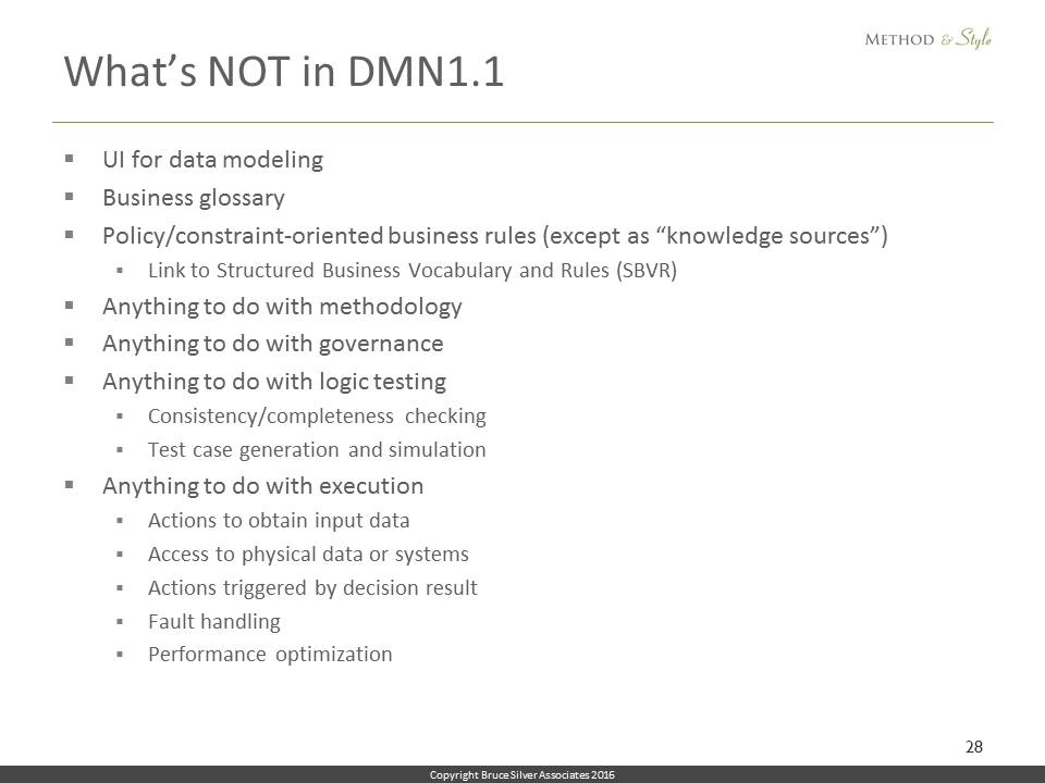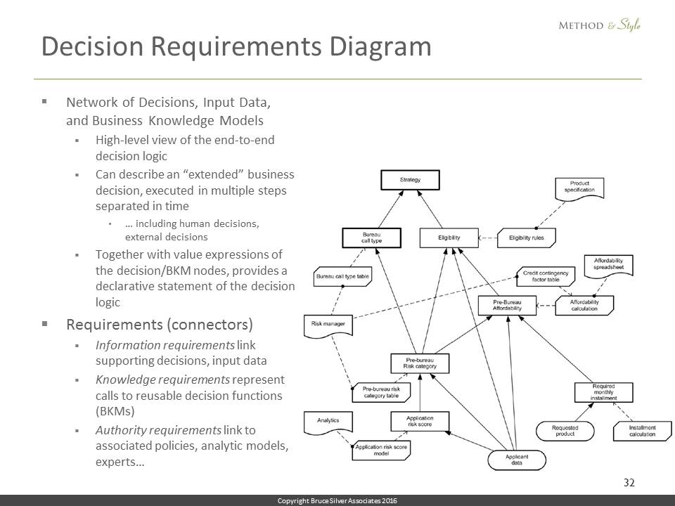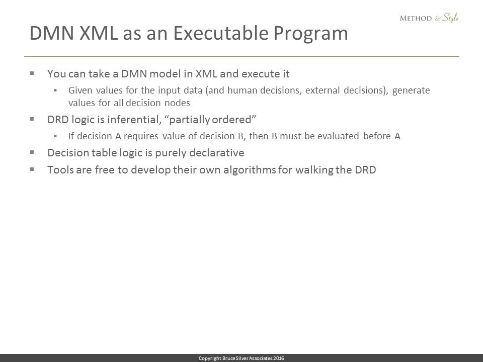 I have been using the term executable, but that doesn’t mean a modeling tool must include a production DMN runtime engine. What I mean is that at design time, given values for all the input data, the tool can display the resulting output for any node in the DRD. Modelers need that for verifying the decision logic they are defining. So we’re talking about test data, logical data, not physical data extracted in mass quantities from real production systems and databases. If you need to handle large datasets in production, or execute the decision logic very fast, you still may want to map the DMN model to the rule language of a commercial business rule engine.
