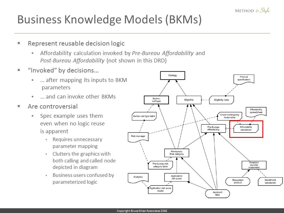 BKMs, it turns out, are somewhat controversial. The way they are represented in the diagram, displaying both the calling decision and the called BKM, is not popular with implementers, and many tools do not support them at all. The spec, however, requires a BKM for reusable or iterated decision logic.