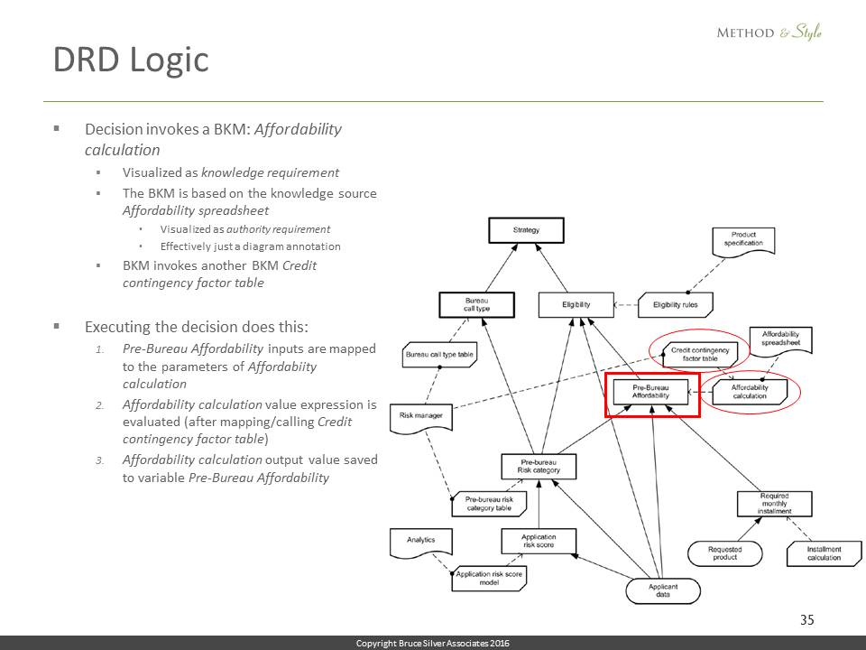 The decision invokes a reusable function, the BKM called Affordability calculation, as indicated by the dashed connector. So when the decision Pre-Bureau Affordability executes, first it maps its inputs into the parameters of Affordability calculation, which invokes in turn the BKM Credit contingency factor table. The output value of the BKM Affordability calculation becomes the output value of the decision Pre-bureau Affordability. The explanation is tedious, but all of this is implied simply by the dashed arrows, the knowledge requirement connectors.