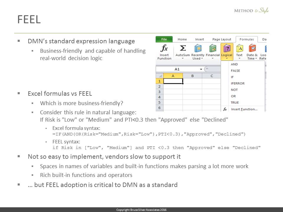 Decision tables and other forms of decision logic contain expressions. To be both executable and tool-independent, DMN requires a standard expression language for those: That is FEEL, which was settled on after long and contentious debate. Languages like UEL were rejected as not business-friendly. There were some who advocated using the Excel formula language – by definition, business-oriented – but in the end DMN invented its own language.