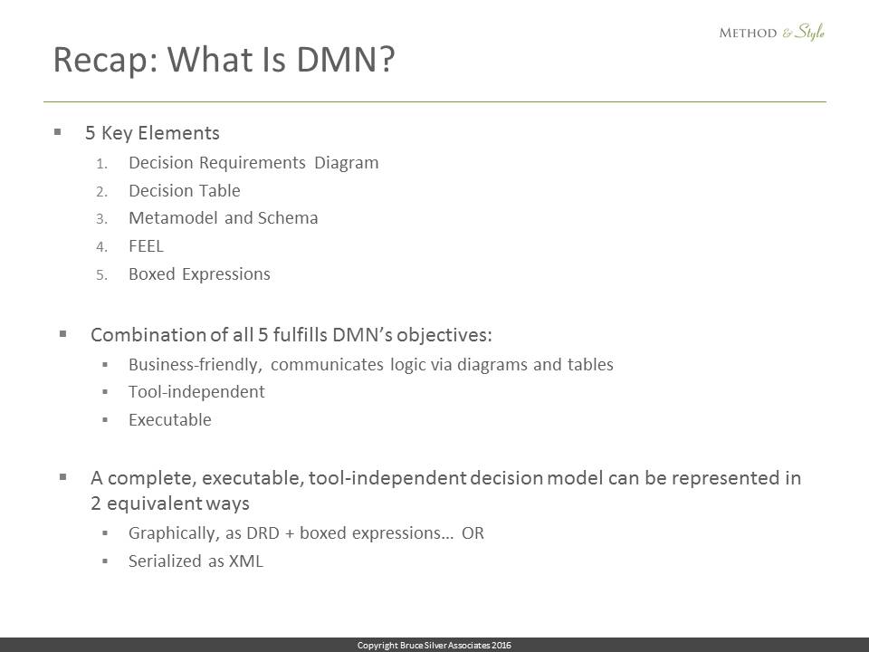 - Standardized tabular formats for all decision logic, called boxed expressions