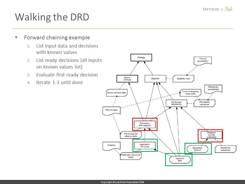 Actually, walking the DRD is the easy part. Here is how it might be done with forward chaining. First, generate a list of all elements with known values. To start, that would be the inputData, outlined here in green, Applicant data and Requested product. Then generate a list of all decisions ready for evaluation, meaning all their information requirements are in the known list. Those are the nodes outlined in red, Application risk score and Required monthly installment. Then pick one of the ready nodes, and evaluate it.