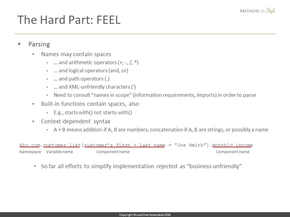 Here you see a FEEL expression string to be parsed. Abc.com is the namespace of the variable customer list. We know it’s a namespace because it appears in the list of imports to the model, so the period here is part of the namespace name. The next period is a path operator, or name qualifier. The brackets indicate a filter expression, identifying elements in the customer list, a list variable, that satisfy a condition. The condition refers to the component of customer list called customer’s first + last name. That whole thing is a name, which we know because customer list is a variable in scope and its datatype definition references a component with that name. Yes the + and apostrophe are part of the name. OK, you get the picture. For the implementer, parsing FEEL this way is kind of annoying, but not impossible.