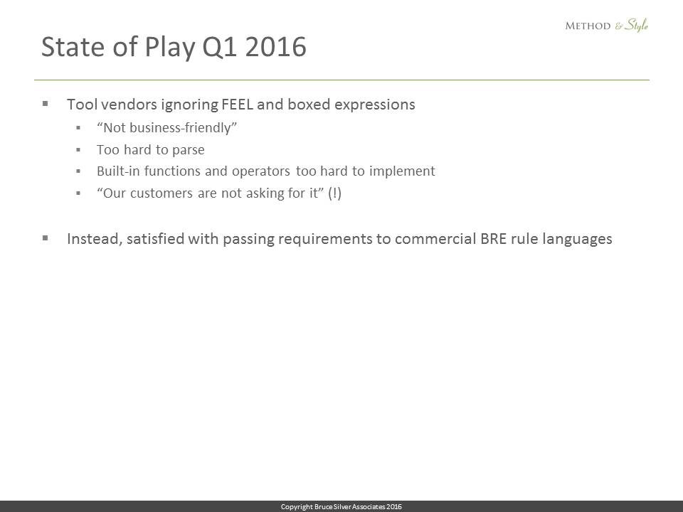One reason why FEEL has not been readily adopted is parsing it is difficult, since variable names may contain spaces. Making FEEL easier to implement is a current topic in the DMN 1.2 task force, and there is inherent tension between ease of implementation and business-friendly syntax. (By the way, the business-friendly syntax side is winning.) In spite of this, we will see commercial FEEL implementations in 2016, which is good news, because FEEL implementation is critical to DMN’s long-term success.