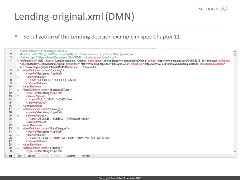 I quickly wrote some first level validation code and tested it on the Lending example serialization posted with the DMN spec on the OMG website. Unlike my own serialization, this one has the spaces in the names. I expected it to be clean, but surprise! 32 level 1 validation errors! So... Before we have execution, DMN modeling tools MUST be able to generate only valid xml serializations. Generating the xml by hand, obviously what happened in this case, is a losing proposition.