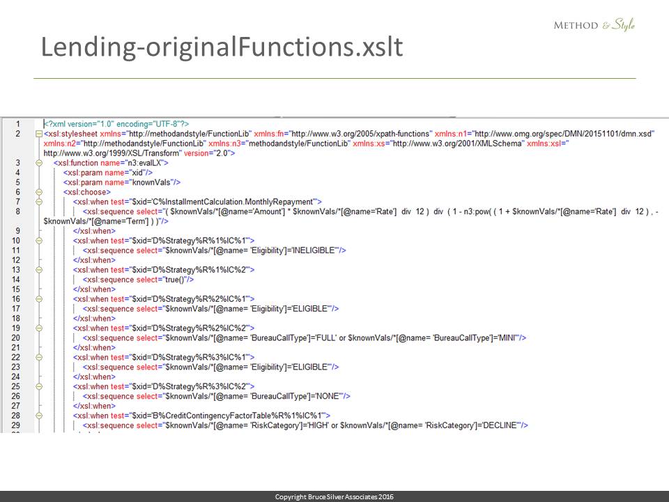 Here is a bit of the function library generated by libGen. Every FEEL expression in the original is mapped to an id and an XPATH equivalent of the FEEL expression, referencing the known values list.