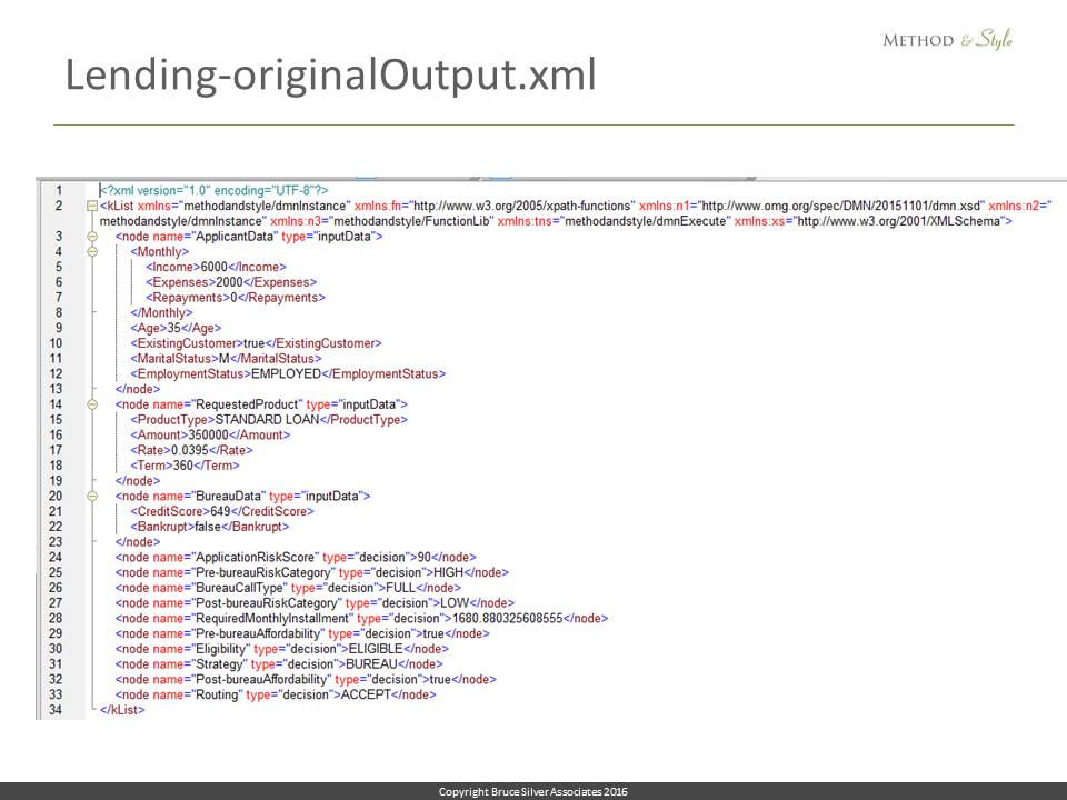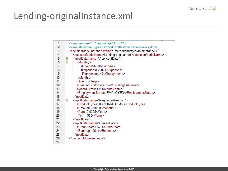 Of course, no one wants to do this manual 2-step procedure on some obscure tool like XMLSpy. But in an unbelievable gesture of goodwill, Trisotech offered to host it for me in their cloud using Saxon, including gluing together the 2 steps. I thought it would take them 3 months, but about a week later I got a message, it’s ready. So here it is, on the left: upload the model – lending-original.xml – and the inputdata instance file, lending instance.xml, click Execute. And the result is shown on the right. Pretty cool.