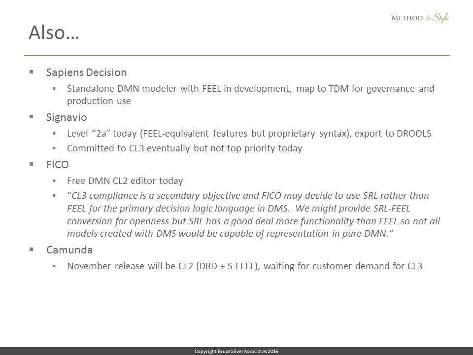 DMN, in spite of everything, is today a success story in the process of unfolding. The promise, requiring full implementation, is real. It’s happening now. We’ll see real Level3 products this year – at least 3, I believe – that deliver on the promise: What you see is what you execute, in a tool-independent language. Vendors who thought they could get away with partial implementation may now be rethinking their strategy.