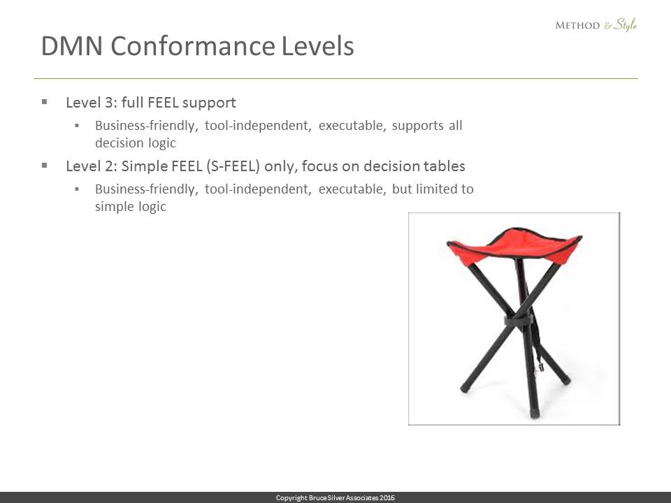In fact the DMN spec itself, recognizing this diversity of opinion about the objectives, formally blesses the idea of partial implementation, defining 3 levels of DMN conformance. Conformance Level 3 embodies the full promise, the disruptive vision, including model-driven decision requirements, business-friendly decision logic definition, and support for FEEL, a tool-independent executable expression language. It provides all 3 legs of a strong stable platform...