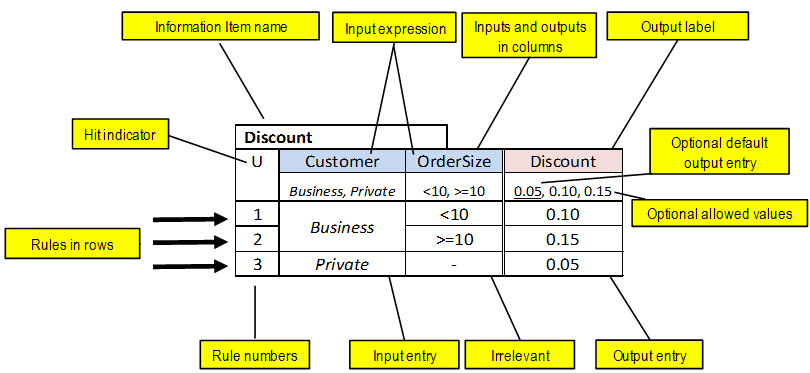 If Customer= "Private" then Discount=0.05In this diagram – in fact, in all the diagrams in the DMN spec – the input entries all reference literal values, but this is misleading. Input entries and output entries both may reference variables representing decision inputs, not just literal values. So decision tables can actually support much richer decision logic than suggested by the examples in the spec.