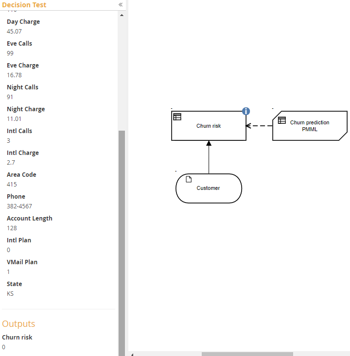 This model was saved as churn.pmml. Trisotech DMN Modeler is able to invoke PMML models and use the returned result within the decision logic. (Note: This requires the PMML subscription feature. Contact Trisotech for details.) As mentioned earlier, DMN functions – typically BKMs – by default use FEEL as their expression language, but the spec also allows them to be externally defined as either Java methods or PMML models. A PMML-based BKM is distinguished by the code P in the Kind cell of its boxed expression, displayed to the left of its list of parameters:The parameters of the BKM are the inputs (DataFields) specified in the PMML model. The PMML DataField denoted as “predicted” is the BKM output.