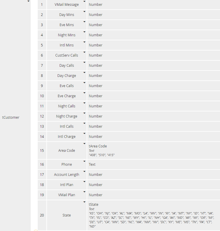 PMML has its own type system, which is slightly different from FEEL, but on PMML import Trisotech automatically creates a corresponding FEEL type for each input (PMML DataField) that is not a simple base type. The created types are namespace-prefixed, as mentioned. You need to convert them to non-imported types, but this is simply done by clicking the copy/paste icon for each one. In this model most inputs are numbers, but because Knime reports their minimum and maximum values in the dataset, Trisotech creates item definitions for them with these constraints. Actually, we'd rather not have these constraints, as it's possible a new test case could have an input value outside of the range or the original dataset. We can simplify the model by eliminating those item definitions in favor of the FEEL base type Number. The only ones we need to keep are the enumerations tAreaCode and tState.Finally we need to add the structure tCustomer describing our input data element, with one component per input DataField in the PMML, and assign it to input data Customer: