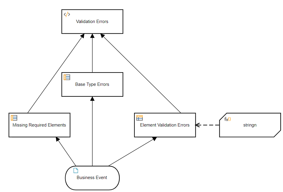 I've broken out the validation into three separate decisions, looking for Missing Required Elements, Base Type Errors, and Element Validation Errors, respectively. The decision Validation Errors merely concatenates the error lists of those three.