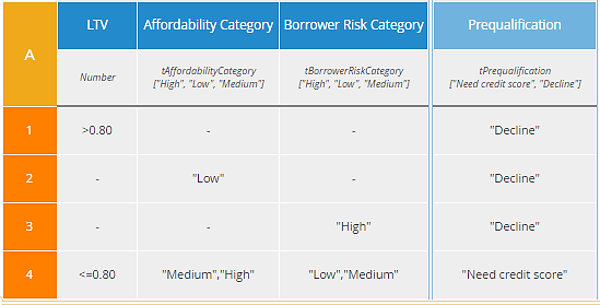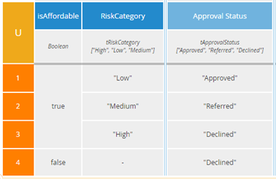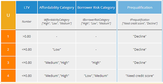 The U table has the advantage that any combination of input values matches exactly one rule, so the resulting output is always crystal clear. But the A table below it is not only simpler to construct, but has the advantage, in this case, of isolating each reason for declining the loan in a separate rule. A loan application with LTV>80%, low affordability, and high borrower risk will actually match all of the first three rules, but they all have the same output value, "Decline."
