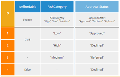 The issue with the P table comes about when a rule whose output value is not the lowest priority includes a hyphen cell. Here rule 4, output value "Declined", has a hyphen in RiskCategory, so its value has higher priority than rule 2 when RiskCategory is "Medium" (and isAffordable is false).