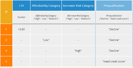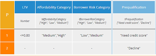 The P2 table has only two rules, including an "else" rule. Notice in this one "Decline" is the lowest priority, unlike the first P table. P2 is in a sense the simplest, but it does not isolate each reason for decline in a separate rule. In most tables with two possible output values, I would probably favor the first P table - call it P1 - over the others, but a case could be made for each of them.