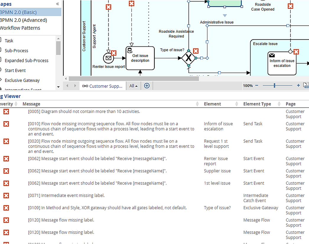 According to the rules of the spec, the Trisotech EU-Rent examples are valid, but they were not created following Method and Style. The original Customer Support model, for example, has many style rule violations. A good way to illustrate Method and Style is to compare the original model with an updated one that follows the style rules.Version 1.1 of the model is shown below. If we click M&S Style Validation, we see it has 17 style errors. That’s quite a few! In this post, I will explain the issues and fix the model to conform with Method and Style. [Note: To access a particular version, from the File/Open dialog, right-click the model name and select Versions. If you don't do that, the tool opens the current version.]