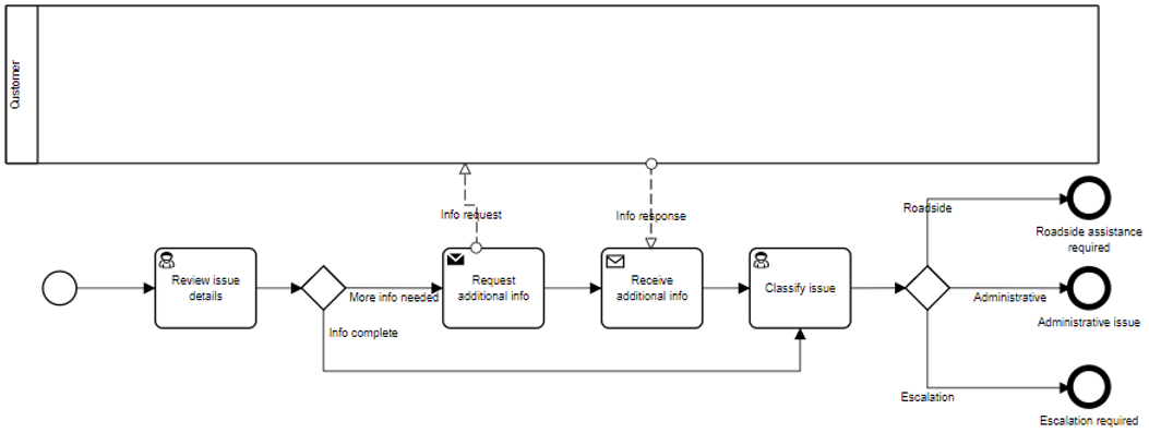 In this EU-Rent model, the pool labeled Customer Support and the pool labeled 2nd Level Support Agent should be lanes within a single process pool, not separate pools. Also, the pool Supplier should be black-box. The Customer Support provider doesn’t really know what the Supplier’s process is. He just knows the message flow interaction with the Supplier. As you will see, there is no significant information lost in making Supplier a black-box pool.