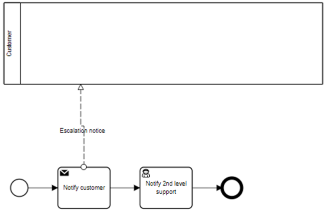 In the Method and Style version of this model there is thus one process pool, Customer Support Process, containing two lanes, 1st Level Support Agent and 2nd Level Support Agent, and two black-box pools, Customer and Supplier.