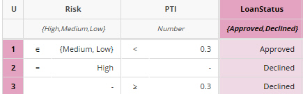 if Risk in ["Low", "Medium"] and PTI <0.3 then "Approved" else "Declined"OK, which is more business-friendly?